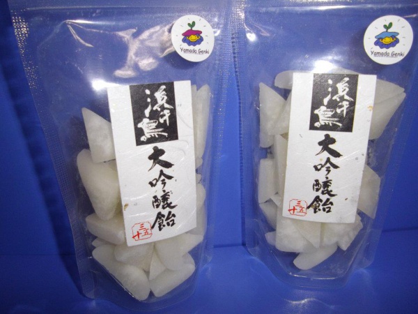 ゲンキちゃんシールを貼った浜千鳥大吟醸飴